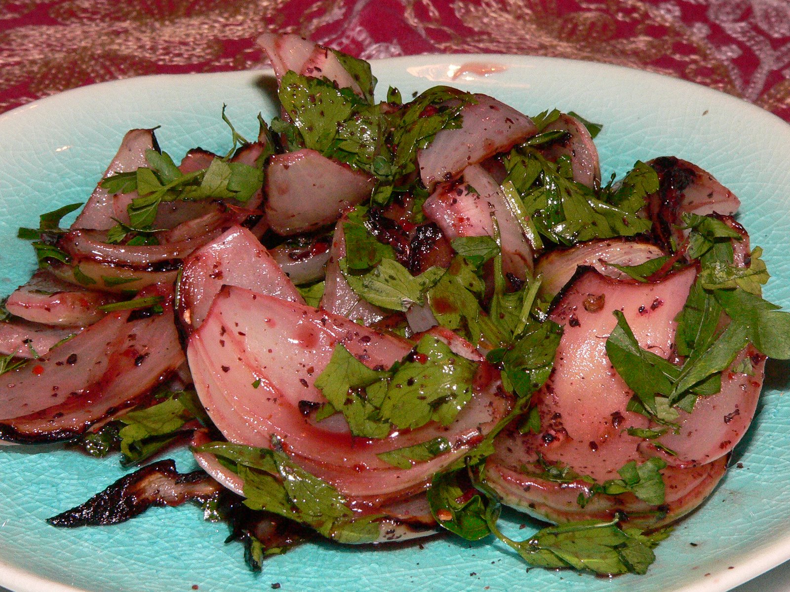 Remove the leaves from the parsley and roughly chop them. Sprinkle over the onions with the sumac and chilli flakes and toss together well. Serve warm, with steak, kebabs, grilled chicken or by itself.